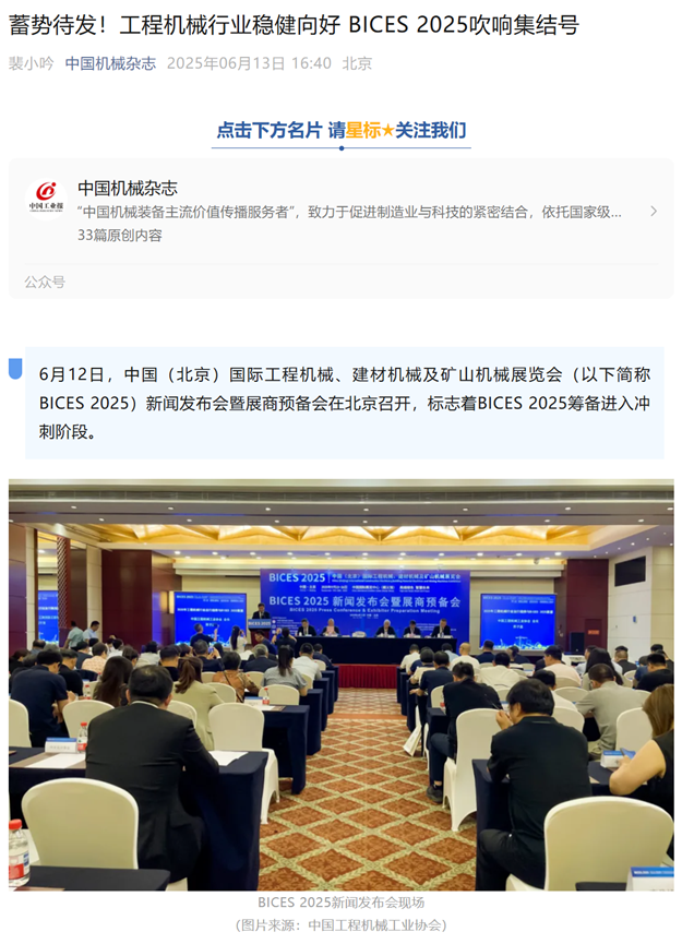 6月12日,中国(北京)国际工程机械、建材机械及矿山机械展览会(以下简称BICES 2025)新闻发布会暨展商预备会在北京召开,标志着BICES 2025筹备进入冲刺阶段。