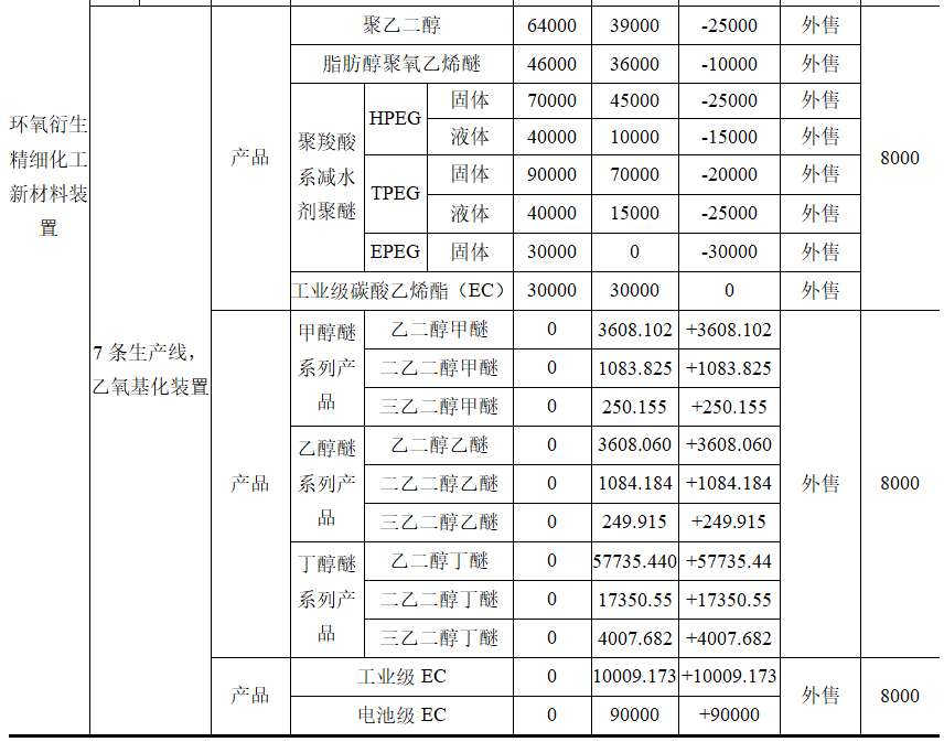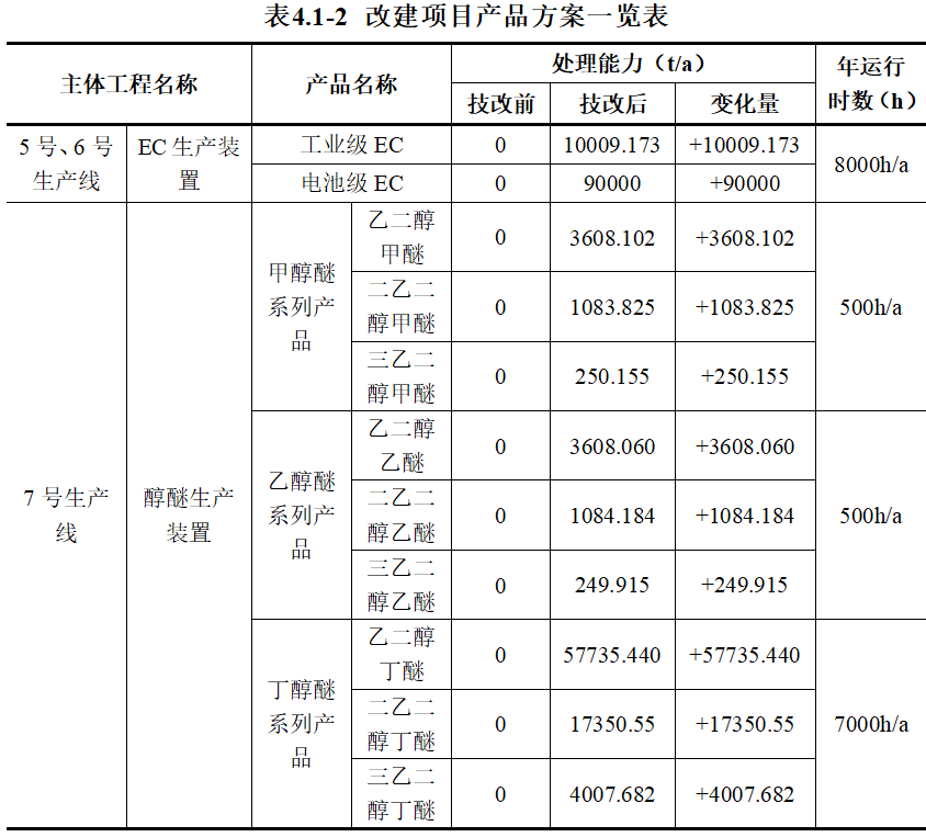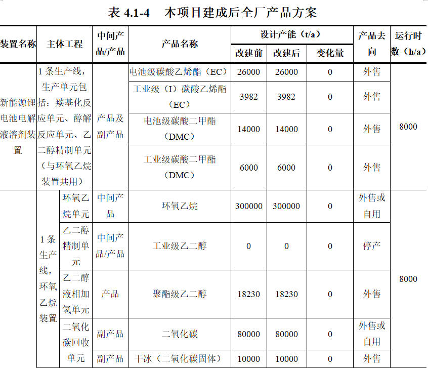 建设规模:对现有乙氧基化装置(EOD装置)和碳酸二甲酯装置(DMC装置)进行改扩建,分别改造内容如下:①乙氧基化装置(EOD装置):作为合成工段;②碳酸二甲酯装置(DMC装置):增加薄膜蒸发系统、精制系统。项目建成后可形成年产9万吨/年电池级EC和1万吨工业级EC产品,8万吨/年乙二醇丁醚系列产品,0.5万吨/年乙二醇甲醚系列产品,0.5万吨/年乙二醇乙醚系列产品。